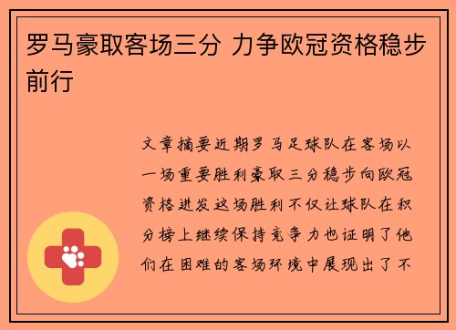 文章摘要:近期,罗马足球队在客场以一场重要胜利,豪取三分,稳步向欧冠资格进发。这场胜利不仅让球队在积分榜上继续保持竞争力,也证明了他们在困难的客场环境中展现出了不屈的精神和强大的实力。从战术布局、球员表现、球队状态、以及未来展望四个方面深入...
