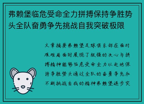 弗赖堡临危受命全力拼搏保持争胜势头全队奋勇争先挑战自我突破极限